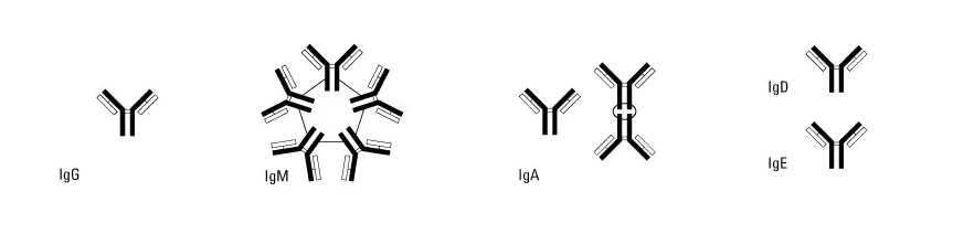 對於抗體有基本構型了解後,仔細分類來說抗體還可以按重鏈類型分為成5種:IgG(γ-chain)、IgM(μ-chain)、IgA(α-chain)、IgD(δ-chain)與 IgE(ε-chain),如下圖所示。