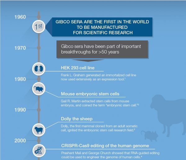 自1960年代起Gibco就投入了生命科學領域,生產了世界上第一批科學研究用血清,一路伴隨科學家們,共同寫下各種生技領域的里程碑,如HEK293 cell line1、Mouse Embryonic Stem Cell的成功分離與培養2、桃莉羊的誕生3以及CRISPR-CAS9技術在人類基因體的編輯4。