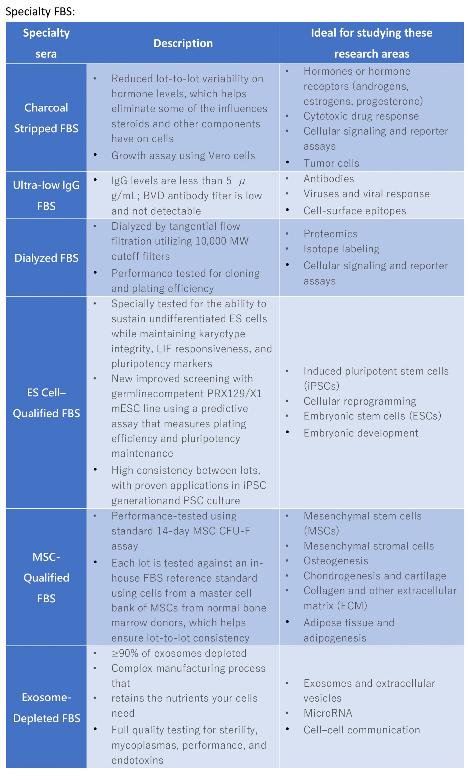隨著研究技術的進步與問題探討的深入,Gibco提供了更多不同類型的胎牛血清以因應更精細的實驗需求,系列商品依照檢測項目分為以下三類: