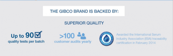 至今Gibco對於血清–尤其是胎牛血清(Fetal Bovine Serum, FBS)–的品質嚴格把關,目標為支援科學家最高品質的研究材料,除了通過國際血清總會ISIA的溯源認證外,Gibco的FBS最高須通過90項以上的品質檢測,並且首創先例與Oritain合作開發Gibco FBS指紋識別技術,藉由測量環境中被植物,動物和土壤吸收的天然元素,然後將這些測量結果匯總為“指紋”,把血清與特定地理位置聯繫起來,從而提供了一種可靠的方式來驗證產品真偽,使科學家們可以放心地確定每瓶血清的來源。