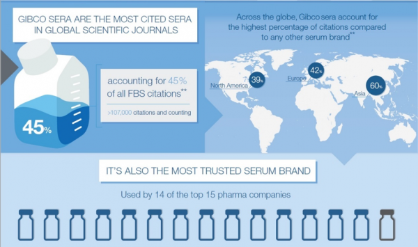在全球科學家的仰賴與信任之下,全球的科學期刊中就有45%的文獻選擇使用Gibco FBS,而業界前15名的製藥公司,更是有14間選擇Gibco FBS作為他們研發與生產的可靠夥伴,Gibco的血清即是的品質保證。