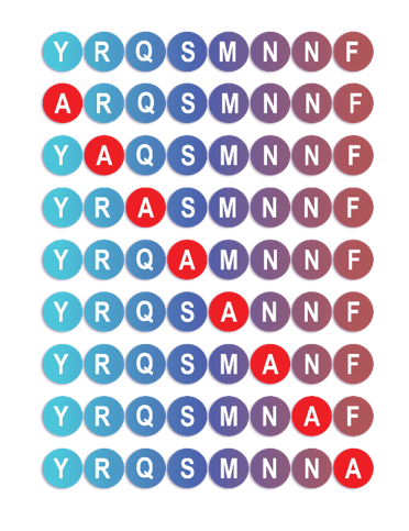 2. Alanine scanning library:原始序列中,用Ala個別置換不同位置,連帶影響epitope的活性,鑑定單一胺基酸對整條序列活性的影響,會用Ala是因為它是最小的掌性胺基酸,因此最常用來取代其他胺基酸位置,然而其他胺基酸也可以這樣使用,但是需要經過評估。