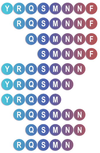 3. Truncation library:找出最有效且片段最短的序列,從N端或C端序列開始一個一個減少,製造出許多短片段,而在Alanine scanning library之後會知道關鍵胺基酸是哪一個,再藉由truncation的方式scanning關鍵胺基酸附近的序列。